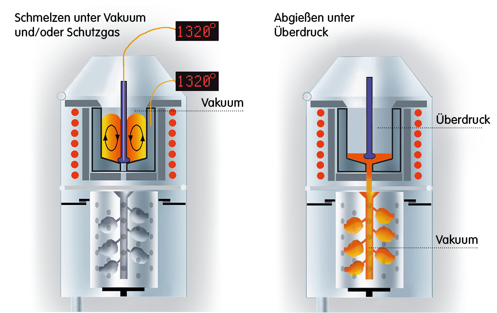 Der Tiegel mit dem geschmolzenen Metall sitzt über der Küvette. Die Abgießöffnung ist während des Schmelzvorgangs durch einen Verschlussstab geschlossen. Beim Start des Gießvorgangs wird der Verschlussstab angehoben und gibt so den Abfluss der Schmelze frei. Zum Abgießen wird der Tiegel unter Druck gesetzt, die Küvette unter Vakuum. Das flüssige Metall wird so auch in feinste Verzweigungen der Gießform gedrückt. Das Vakuum verhindert Lufteinschlüsse und Porosität. Bei vielen VC-Modellen wird eine überragende Formfüllung noch durch das Indutherm Vibrationssystem unterstützt.