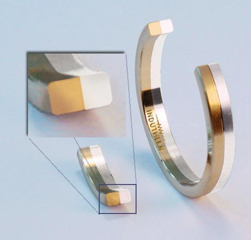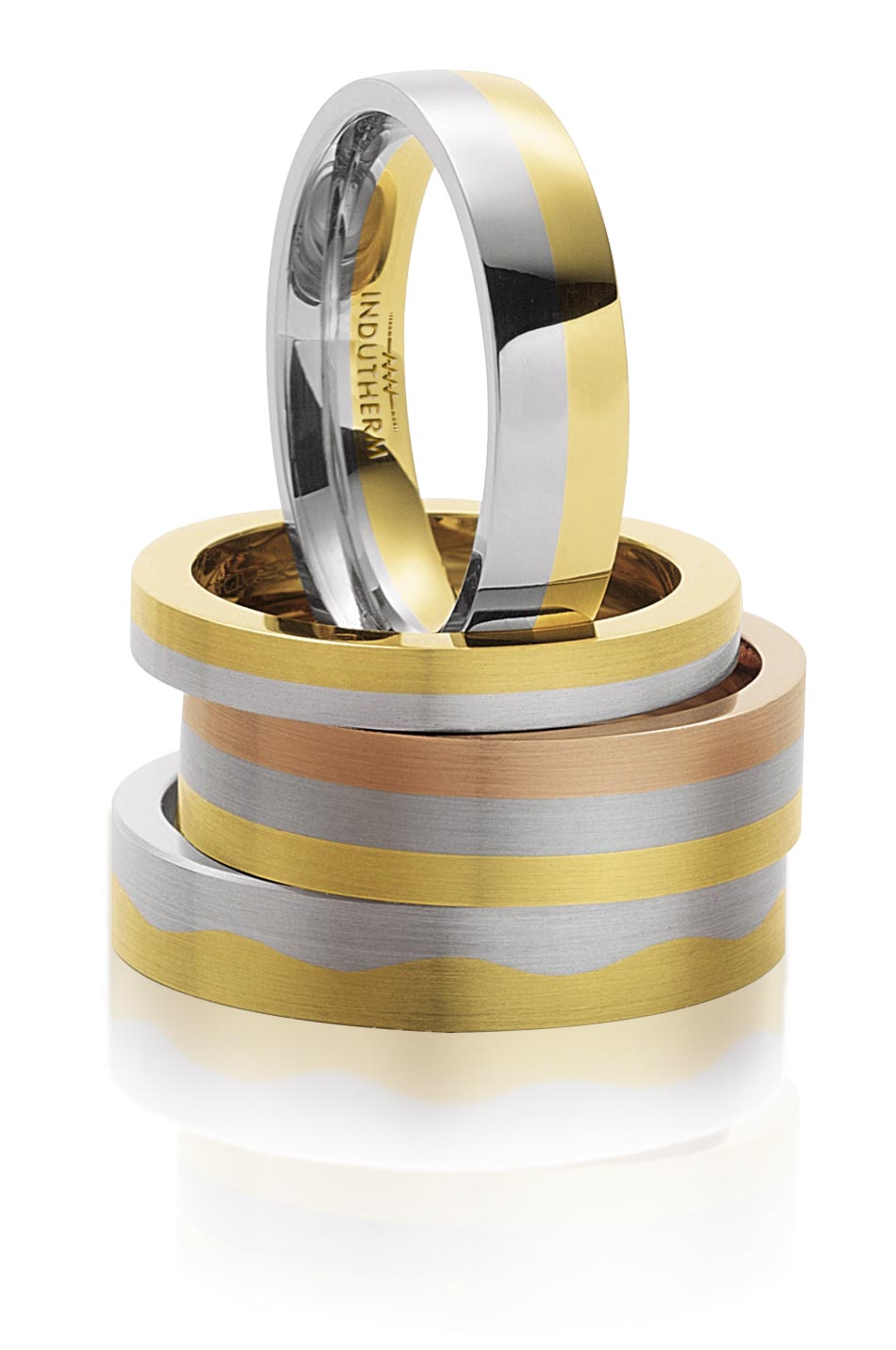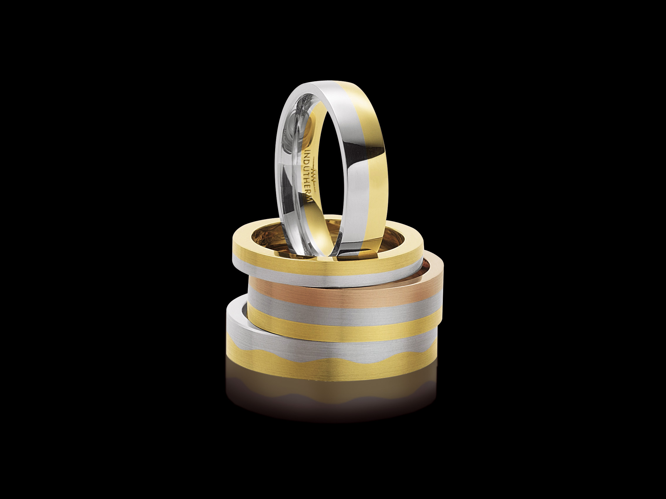 Das Diffusionsschweißen (häufig auch „Sintern” genannt), ist das optimale Verfahren zur Herstellung von Multicolor-Ringen. Dabei wer den Metalle unter Druck und bei Temperaturen knapp unter dem Erstarrungspunkt verarbeitet. Der Druck wird pneumatisch erzeugt und nicht mechanisch über eine Gewindespindel. Ein Bruch der verwendeten Grafit-Elemente bei Ausdehnung durch Hitze wird dadurch vermieden. Die Verbindungsschicht hat die gleiche Belastbarkeit wie das Metall selbst. Aufweiten und Reduzieren von fertigen Trauringen ist über einen sehr großen Bereich problemlos möglich (7 Größen und mehr).