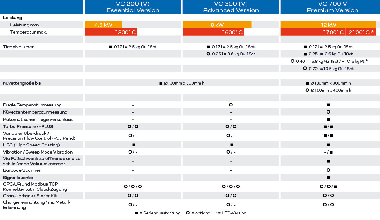 - Verschiedene Tiegelgrößen bis zu 10,5 kg Au 18k, bis zu 5 kg Pt (HTC-Version)
